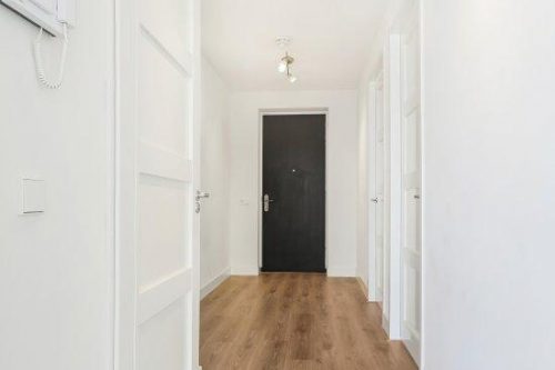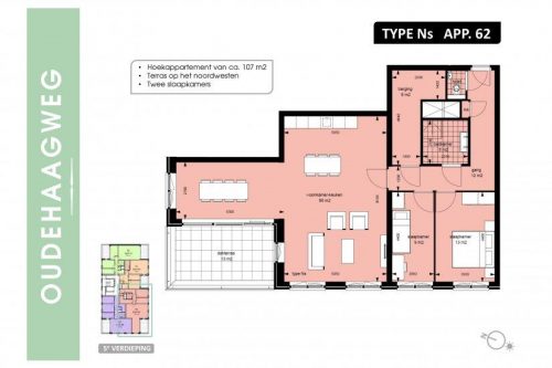 Gezamenlijke entree; lift naar 5e verdieping; voordeur. Binnenkomst in de hal. Links bevinden zich de 2 ruime slaapkamers Aan de rechterzijde de badkamer voorzien van inloopdouche, handdoekradiator en wastafelmeubel. Hiernaast apart toilet. Aan het einde van de gang bevind zich de zeer ruime woonkamer met hoge ramen, toegang tot ruim zonnig balkon en open keuken voorzien van koelkast met vriesvak, gasfornuis, afzuigkap, combi oven-magnetron en vaatwasser. Opberghok naast de badkamer met wasmachine aansluiting.