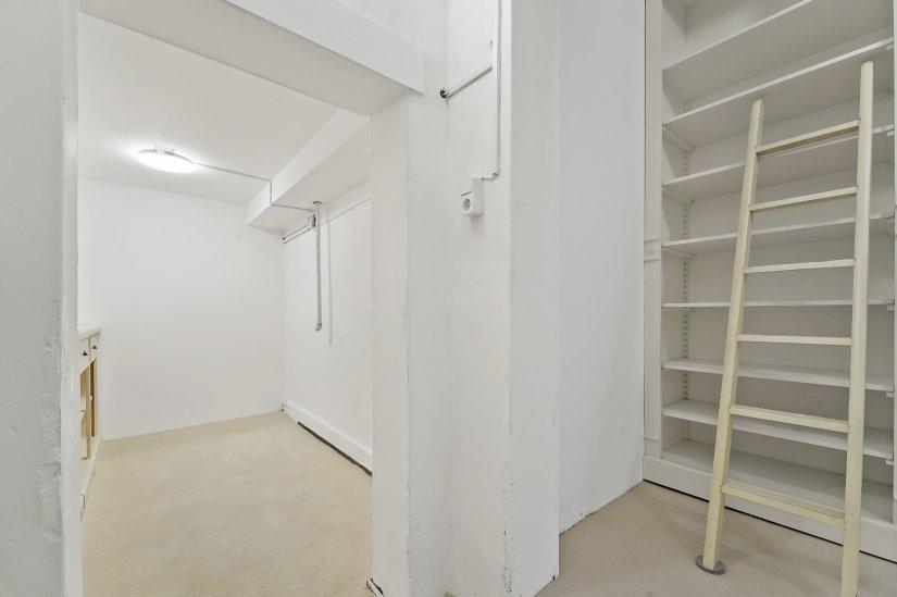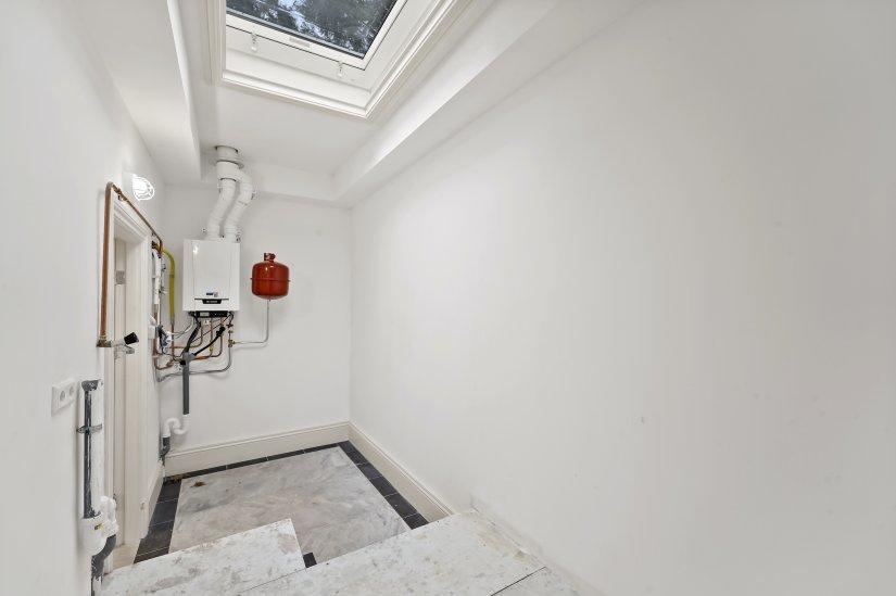 Vanuit de woonkamer kun je doorlopen naar twee ruimtes die als opberghok gebruik kunnen worden en een grote wasruimte met dakraam. Ook biedt de woonkamer toegang tot een kelder die gebruikt kan worden als extra opslagruimte.