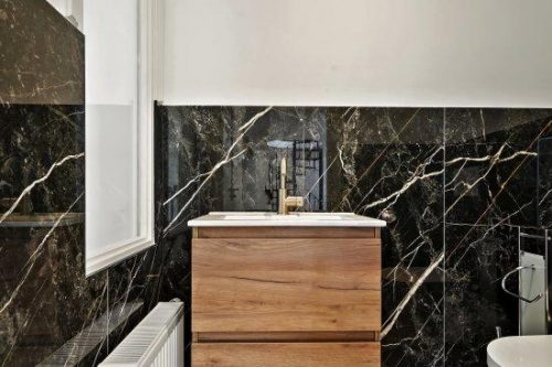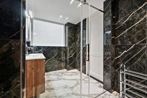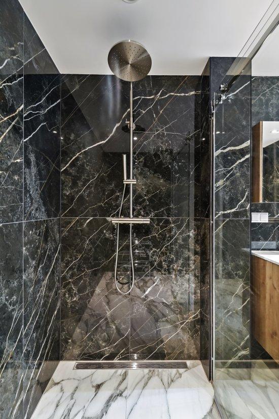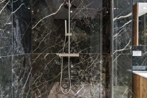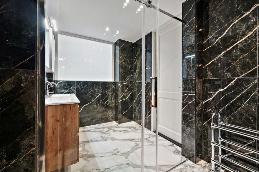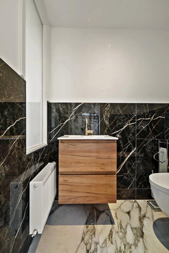 Naast de keuken bevindt zich de badkamer die is voorzien een inloopdouche, wastafelmeubel en handdoek radiator.