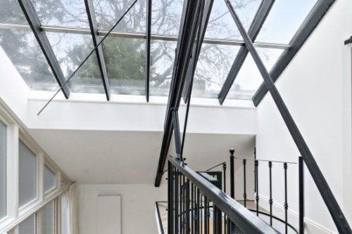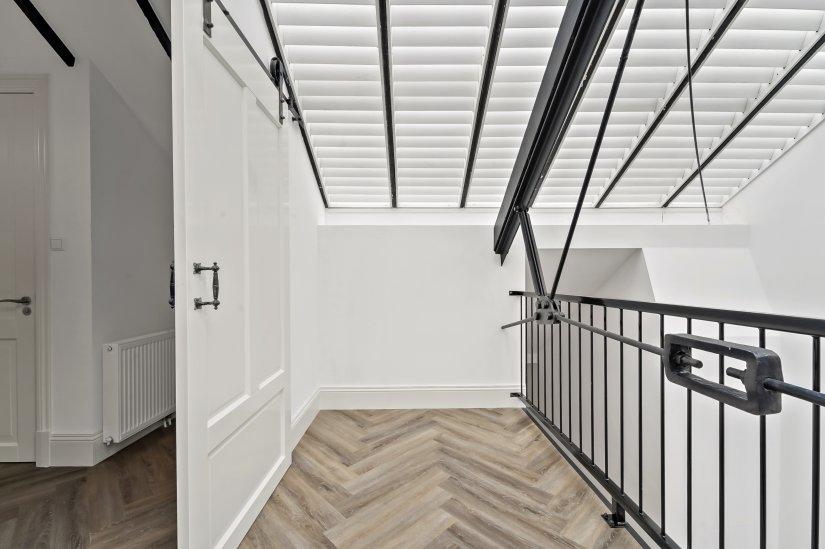 Binnenkomst in ruime hal die leidt naar de prachtig lichte woonkamer met karakteristieke wenteltrap en de glazen dakramen. De glazen deuren bieden de entree tot de gezellige binnentuin.