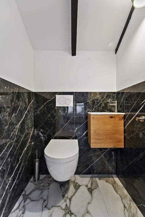 De wenteltrap biedt de toegang tot de lichte slaapruimte. Naast de slaapkamer bevindt zich een tweede toilet met een extra wastafeltje.