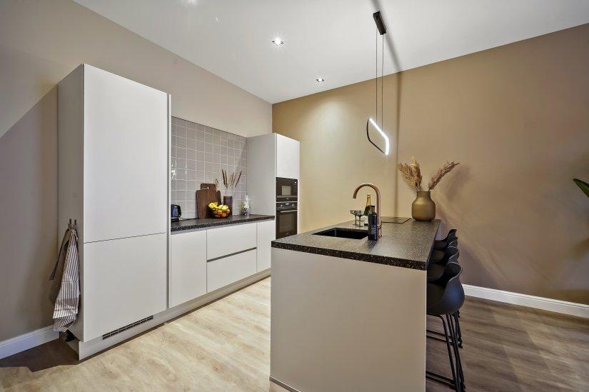 Entree op de begane grond. Trap naar de 1e verdieping. Binnenkomst in de ruime woning met grote ramen. Gelegen aan de voorzijde. Vanuit hier toegang tot de keuken voorzien van; koelkast, inductie met ingebouwde afzuiging, combi-oven magnetron. Hiernaast bevindt zich de badkamer met douche en 2 persoons wasbak.