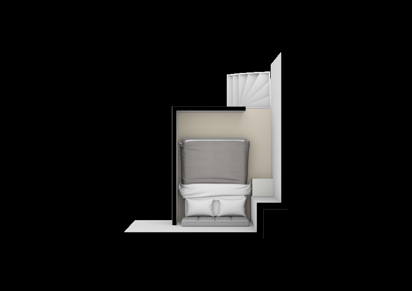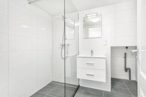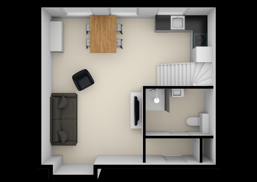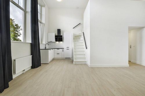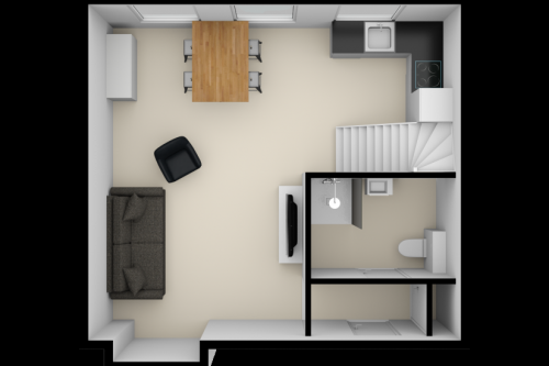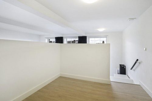 Binnenkomst in de woonkamer met open keuken die is voorzien van vaatwasser, oven, elektrische kookplaat en afzuigkap; badkamer is voorzien van douche, toilet, handdoekradiator, wastafel en wasmachine aansluiting. De trap naar boven is de entree van de slaapkamer.