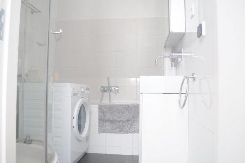 Open keuken voorzien van vaatwasser, koelkast met vriezer en kookplaat. 2 slaapkamers en badkamer voorzien van bad (met bubbels), douchecabine, vaste wastafel en wasmachine.